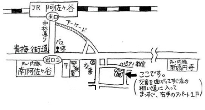 直進約100mの右手のカサ・フェリス阿佐ヶ谷1Fです。(バス停より徒歩5分)